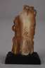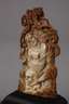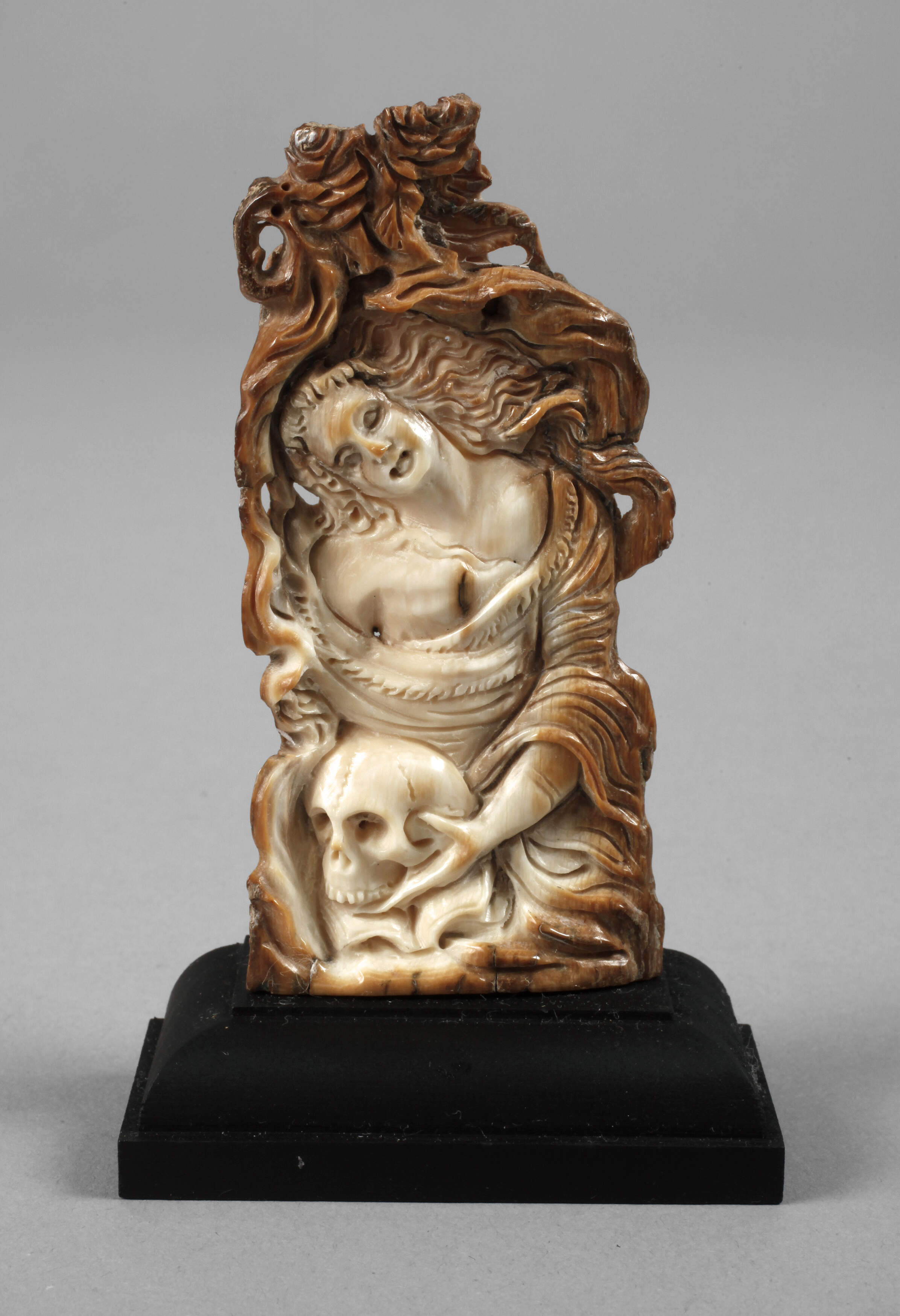 20. Jh., Bein beschnitzt, reliefartige Darstellung einer jungen, leicht bekleideten Schönheit, im Schoß einen Totenschädel haltend, flankiert von Blüten und Rankwerk, auf flachem Holzsockel montiert, H 10 cm.