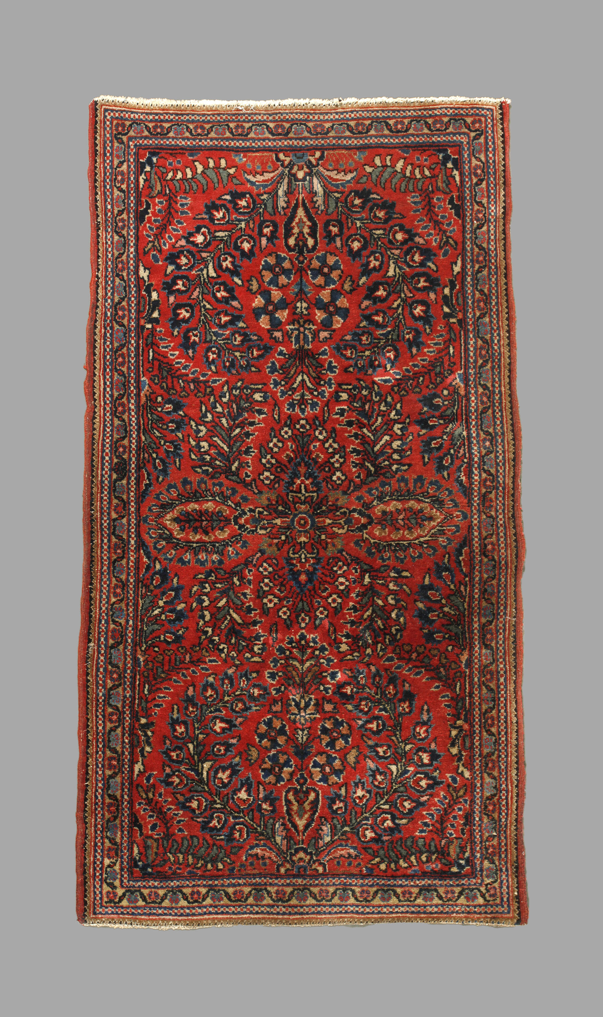 1. Hälfte 20. Jh., kleinteiliger floraler Dekor über rostrotem Fond, hell abgesetzter Bordürenbereich, Fransenbesatz gekürzt, leichte Altersspuren, etwas reinigungsbedürftig, Maße 120 x 61 cm.