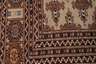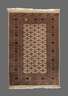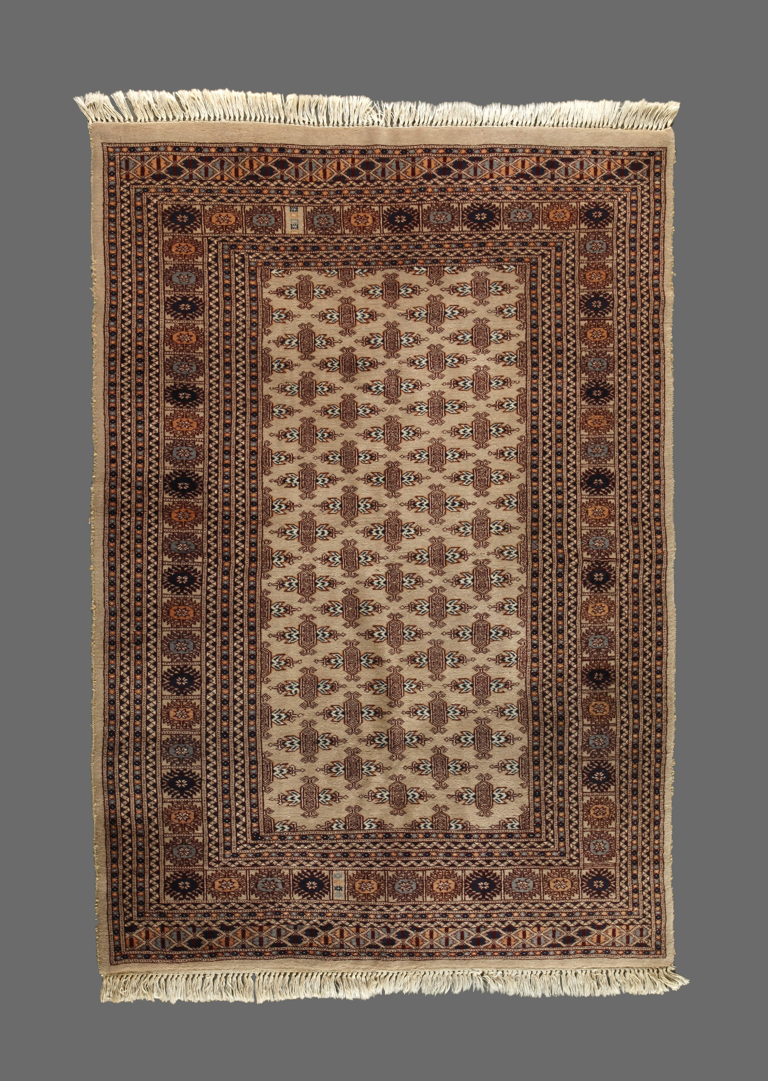 2. Hälfte 20. Jh., in hellen Erdtönen gestalteter kleiner Teppich, das gleichmäßig durchmusterte Mittelfeld gerahmt von unzähligen schmalen Ornamentbändern, gute Erhaltung, Maße 173 x 122 cm.