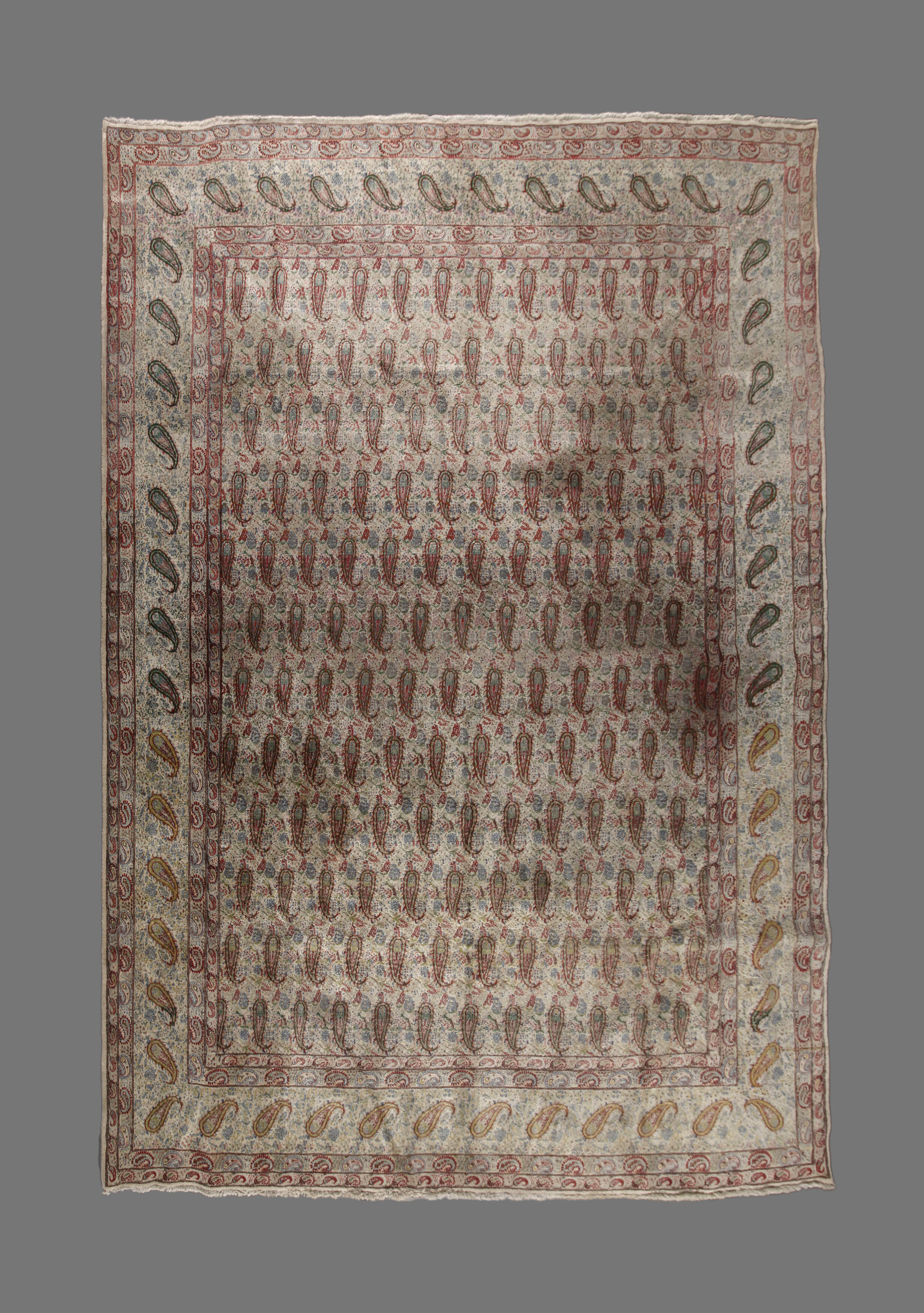 2. Hälfte 20. Jh., zarter Paisleydekor über hellem Fond, reinigungsbedürftig, mit Zertifikat, Maße ca. 381 x 301 cm.