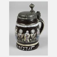um 1650, auf dem Deckel monogrammiert M.B. 1665, Sinterbrandt, Braunsteinengobe, schwarzbraune Salzglasur, Boden handabgedreht, aufgemodelte Friese und Kartuschen, dazwischen Säulen, aufgerolltes Zickzackmuster, Gurtfurchen mit Zinneinlagen, Zinnstandring, originaler übergreifender Deckel mit Muscheldrücker, klappbare Tüllenabdeckung, am Stand unten sind unter der Zinnmontierung kleine Ausbrüche zu sehen und eine winzige Glasurfehlstelle an der Wandung, sonst altersgemäß sehr guter Originalzustand, H 31 cm, Quelle: Josef Horschik, Steinzeug von Bürgel bis Muskau 15.–19. Jh., S. 463 Nr. 9 & 10, dort Krug und Schraubkruke mit nahezu identischem Dekor (früher Annaberg oder Freiberg zugeschrieben).
