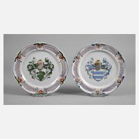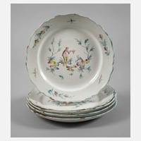 Frankreich, gepinselte Marke VP ligiert für Manufacture Veuve Perrin um 1740–1803 in Marseille, hellgrauer Scherben weiß glasiert, bemalt mit bunten Scharffeuerfarben, gewellte Fahne, Darstellung jeweils zwei angelnder Personen am Teich, die Fahne verziert mit Insektenmalerei, alle mit Bestoßungen am Rand (durch ehemals angebrachte Wandaufhängungen), D je ca. 24 cm, Quelle: Dr. J. G. Th. Graesse, Führer für Sammmler von Porzellan und Fayence, Klinkhardt & Biermann 1999, S. 220.