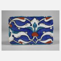 16. Jh., ehemals als Teil eines Bandes aus hellem Schamottescherben in floraler Handbemalung, schwarz konturierte Blattmotive, kleinere Fehlstellen an den Kanten, Maße 13 x 9 cm.