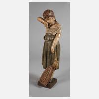 um 1890, unsigniert, Hersteller Goldscheider Wien, Schriftzugmarke 1890-1899, Prägezusatz Reproduction Reservee, Ritznummer 1363?, Prägebuchstabe P, Pinselnummer VII sowie Sammlungsnummer i3 in Rot, heller Scherben erdfarben bemalt, auf rechteckiger Plinthe stehendes Mädchen, eine kopflose Schlenkerpuppe haltend und sich mit einer Hand die Tränen wegwischend, guter, fachmännisch restaurierter Zustand, H 55 cm.