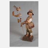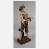 um 1910, unsigniert, Hersteller Kölner Kunstfiguren-Fabrik H. & M. Löhnberg, undeutliche Prägemarke, geritzte Modellnummer 1549 sowie 63, heller Scherben erdfarben bemalt, auf quadratischem Sockel an Baumstammstütze stehender Tiroler Knabe mit Umhängetasche, als Raufbold einen Ärmel hochkrempelnd und etwas grimmig ausrufend, Attribute fehlen (Papierzweig alt ergänzt) und minimale Farbverluste, sonst guter und minimal fachmännisch restaurierter Zustand, H 39 cm.
