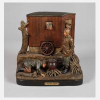 um 1900, signiert und auf Messingplakette bezeichnet "Les deux gosses/par J. Le Guluche", Hersteller Fontaine & Durieux Paris, geprägte Kreismarke und Modellnummer 249, Terrakotta erdfarben bemalt, über oblonger Plinthe kulissenartiges Terrain mit aus Wohnwagen schauendem Paar, davor zwei Kindern beim Entzünden eines Lagerfeuers mit Kochkessel, Szene aus dem gleichnamigen, 1880 erschienenen Roman von Pierre Decourcelle (1856 Paris bis 1926 ebenda), ein Chip an der rechten Sockelkante, sonst guter, fachmännisch restaurierter Zustand, H 31 cm. Künstlerinfo: französischer Bildhauer (1849 Plourvino bis 1915 Vellejuif), tätig für die Manufakturen Villenauxe-la-Grande (Aube), L'Isle-Adam (Val-d'Oise) sowie Mauger und Letut. Quelle: Wikipedia.