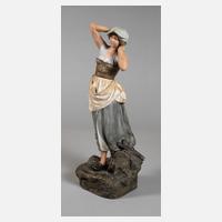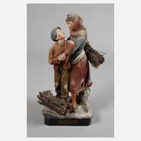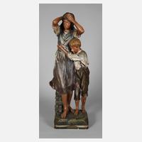 um 1900, unsigniert und ungemarkt, Terrakotta farbig bemalt, auf Felsensockel stehende junge Frau und nebenher schreitender Knabe in Tracht, beim Tragen verschiedener, teils auf dem Kopf balancierender Krüge, Körbe und Netze, die drei größeren Gefäße zum Befüllen als Hohlkörper gestaltet, ein Korbrand minimalst gechipt, sonst fachmännisch restaurierter Zustand, H 58 cm.