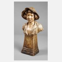 Entwurf um 1905, signiert Cherc (wohl Pseudonym für Hans Schoerk), Hersteller Friedrich Goldscheider Wien, Modellnummer 3214, weitere Nummern 44 und 1 sowie Buchstabe C, heller Scherben in Beigetönen bemalt, auf hohem Podest Bruststück eines Jungen in offenem Hemd mit gelocktem Haar und Krempenhut, guter, fachmännisch restaurierter Zustand, H 35,5 cm. Künstlerinfo Hans Schoerk: Wiener Bildhauer (1849 Wien bis 1899 Wien?), Schüler der Wiener Akademie. Quelle: Dechant/Goldscheider, Firmengeschichte und Werkverzeichnis, S. 595f.