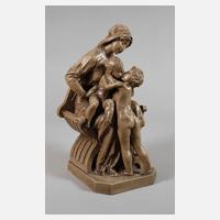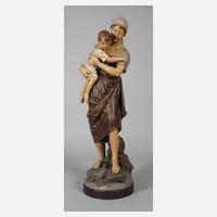 um 1900, signiert, Hersteller Fontain Durieux Paris, geprägte Kreismarke, Schriftzug Terre cuite Gd Feu und Fabrication Francaise, Terrakotta erdfarben bemalt, auf Natursockel stehende junge Mutter in liebevoller Geste mit dem vor ihr stehenden Knaben, guter, fachmännisch restaurierter Zustand, H 65 cm. Künstlerinfo: Pariser Bildhauer des 19. Jh., Gehilfe in der Werkstatt von Jean-Baptiste Carpeaux (1827-1875), gründete nach dessen Tod vermutlich eine eigene Werkstatt, Quelle: Germanisches Nationalmuseum, Kulturgut, Heft 47, IV. Quartal 2015.