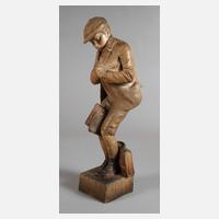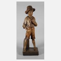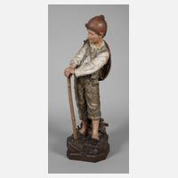 Entwurf 1898/99, signiert Cherc (wohl Pseudonym für Hans Schoerk), Hersteller Friedrich Goldscheider Wien, Skulpturen- und Adlermarke 1902-1910, Zusatz Farbique en Autriche, geprägte Modellnummer 1487, weitere Nummern 266 und 17 sowie Buchstabe S, heller Scherben erdfarben bemalt und reich goldstaffiert, auf Rechtecksockel breitbeinig an Grenzstein stehender Bauernbub mit Hut, ohne Zigarre und minimale Farbfehlstellen, sonst guter, fachmännisch restaurierter Zustand, H 96,5 cm. Quelle: Dechant/Goldscheider, Firmengeschichte und Werkverzeichnis, S. 323, Nr. 1487. Künstlerinfo: Hans Schoerk, Wiener Bildhauer (1849 Wien bis 1899 Wien?), Schüler der Wiener Akademie. Quelle: Dechant/Goldscheider, Firmengeschichte und Werkverzeichnis, S. 595f.