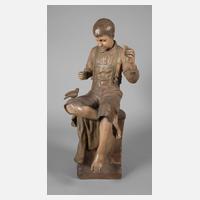 um 1898/1999, signiert, Hersteller Friedrich Goldscheider Wien 1895-1910, geprägte Schriftzugmarke, Zusatz Reproduction Reservee, Modellnummer 1929 sowie 69 und 24, Buchstabe P und Pinselnummer II, heller Scherben erdfarben bemalt, auf rechteckigem Natursockel mit Baumstammstütze stehender Knabe mit Hut, beim Lesen in der aufgeschlagenen Zeitung, Attribut fehlt, sonst guter, fachmännisch restaurierter Zustand, H 58 cm. Quelle: Dechant/Goldscheider, Firmengeschichte und Werkverzeichnis, S. 338, Abb. 1929, S. 570. Künstlerinfo: auch Xaniroff, unbekannter Bildhauer des 19./20. Jh., um 1900 für Goldscheider tätigen, schuf zahlreiche Figuren. Quelle: Dechant/Goldscheider, Firmengeschichte und Werkverzeichnis, S. 570.