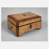 um 1900, ungemarkt, aufwendig furniertes Kästchen aus Vogelaugenahorn und Kirschholz, der Deckel mit freier Monogrammkartusche, Deckelinnenseite mit handschriftlicher Liedangabe der vier Melodien, verglastes Walzenspielwerk mit intaktem Stimmkamm, Werk läuft, reinigungsbedürftig, Alters- und Gebrauchsspuren, Maße 6 x 12 x 9 cm.