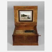 um 1910, mahagonifurnierter Korpus, der scharnierte Deckel mit zentralem eingelegten Blütenbukett, Deckelinnenseite mit Farblithografie Dresdenansicht, Spielwerk gemarkt und nummeriert 6118, gut erhaltener Doppelkamm, beigegeben neun Platten, Werk läuft, etwas reinigungsbedürftig, Maße 31 x 52 x 47 cm.