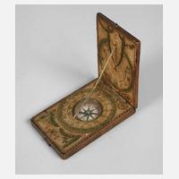 Fürth, Ende 18. Jh., signiert J.G. Kleininger fec, klappbares Hartholzgehäuse mit farbig lithografierter Papierbespannung, unter Glas eingelassener Kompass, Ziffernblatt mit römischen und arabischen Zahlen, Fadenspannung, Alters- und Gebrauchsspuren, Maße 1,5 x 9 x 5,5 cm.