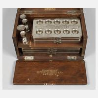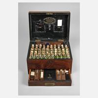 Anfang 20. Jh., gemarkt Thompson & Capper Liverpool Birkenhead Manchester, in Wurzelholz furnierter schlichter Korpus, lederverkleidetes, teils goldgeprägtes Innenleben, reich unterteilt, für 50 Glasphiolen, original beschriftet, sowie weiteres Zubehör, Alters- und Korrosionsspuren, Maße ges. 17 x 28 x 20 cm.