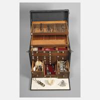 1930er Jahre, mit schwarzem Kunstleder bespannter Hartschalenkoffer mit klappbarem Deckel und Front, reich unterteiltes Innenleben mit Nummerierung, 14 Schübe sowie zwei klappbare Laden, mit zahlreichem Zubehör zur Zahngesundheit, Alters- und Gebrauchsspuren, nicht komplett, Maße 30 x 39 x 25 cm.