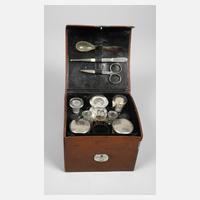 1. Hälfte 20. Jh., gemarkt Eduard Ackermann königl. Hoflieferant Berlin W., klappbare Lederschatulle mit geschwärztem Innenleben, mehrfach unterteilt, mit verschieden großen Aufnahmen für Glasflakons und Schraubgläschen, mit teils verchromten Metallmontierungen, des Weiteren zwei kleine Schübe und Tasche, original befüllt, zusätzlich mit Schere, Pinzette und Löffel aus Horn, stärkere Alters- und Gebrauchsspuren, Maße ges. 12 x 16 x 14 cm.
