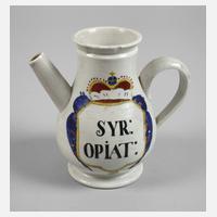 Ende 19. Jh., heller Scherben, cremefarben gefasst, Front verziert mit von Kurhut bekrönter Kartusche, gepinselte Inhaltsangabe Syr. Opiat, gebauchtes Kännchen mit Ohrenhenkel und gerader zylindrischer Tülle, Mündung mit kleinem Ausbruch, H 15 cm.
