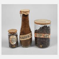 um 1900, Klarglasbehälter mit betitelten Etiketten, Verschlüsse aus Pergament, original befüllt mit Farnkrautwolle, Benzoe Siam und Granatapfelschalen, Altersspuren, H max. 20 cm.