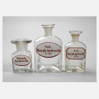 Anfang 20. Jh., Korpora in Dreiecksform aus Klarglas, teils facettierte Stopfen, alle mit handschriftlicher Inhaltsangabe, gute Erhaltung mit leichten Altersspuren, H max. 15 cm.