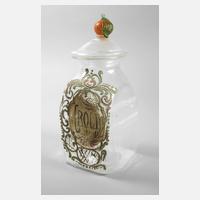 um 1800, farbloses Glas, blasiger Abriss, angesetzter Scheibenfuß, bauchiger Korpus mit opaker Emaillebemalung, Aufschrift Ess: Ligni. Aloes. (Adlerbaum Holz Essenz), guter unbeschädigter Zustand, H 14 cm.