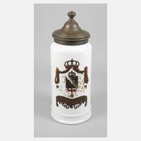 19. Jh., farbloses Glas formgeblasen, der Mündungsrand nach außen umgeschlagen, schauseitig opake Emaillebemalung, Kartusche mit Aufschrift Elixir, ohne Deckel oder Stopfen, Glas von der Herstellung etwas schlierig, H 20,5 cm.
