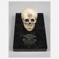 datiert 1926, Briefbeschwerer mit flacher Basis aus dunklem Onyx, darauf montierter Totenschädel aus Biskuitporzellan, auf gravierter Plakette bezeichnet „Memento Mori Weihn. 1926 D. Lbf. O. Engelhardt“, leichte Altersspuren, L 14 cm.