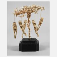 20. Jh., Bein beschnitzt, in Anlehnung an Jaques Callots Radierung „Der Galgenbaum“, aus dessen 18-teiligem Zyklus „Die großen Schrecken des Krieges“, welches die Exekution von Dieben zeigt, auf geschwärztem Holzsockel montiert, H ca. 20 cm.