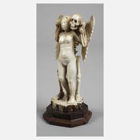 20. Jh., Hirschhorn aufwendig beschnitzt, vollplastische Darstellung eines geflügelten Totenmannes, in seinen Fängen eine jugendliche Schönheit, auf gedrechseltem Hartholzsockel, H 13 cm.