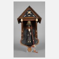 20. Jh., Holz geschnitzt, farbig gefasst, eingesetzte Partien aus Bein, architektonisch gestalteter Baldachin mit abgehängter Glocke mit Zugband, bewacht von Gevatter Tod, gute Erhaltung, H 47 cm.