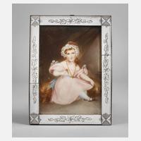 Ganzfigurenbildnis eines auf einem Kissen sitzenden kleinen Mädchens im rosa Kleid mit Häubchen, eine Rose in der Hand haltend, feine miniaturhafte Malerei, Mischtechnik auf Platte, 1. Hälfte 20. Jh., rechts unten signiert "Maré" hinter gewölbtem Glas gerahmt, Falzmaße ca. 14 x 10 cm.