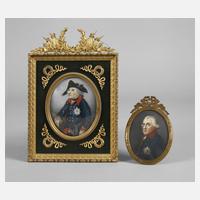 Ende 19. Jh., eine undeutlich signiert, Gouache auf Platte, im Oval festgehaltene Halbfigurenbildnisse des preußischen Regenten Friedrich II. in Uniform mit Bruststern vor monochromem Fond, jeweils hinter Glas in schmaler vergoldeter Messingleiste gefasst, Maße max. 22 x 15 cm.