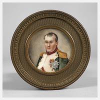 Anfang 20. Jh., unsigniert, Gouache auf Platte, Kopie nach Jean-Baptiste Isabey (1767-1855), Brustbildnis des französischen Kaisers vor monochromem Fond in Uniform mit angelegtem Ordenskreuz und Bruststern zum Großkreuz der Ehrenlegion sowie dem 1805 gestifteten Orden der eisernen Krone Italiens, also Tondo hinter Glas in punziertem Messingrahmen gefasst, D gesamt 11 cm.