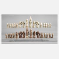 20. Jh., ungemarkt, aus Speckstein geschnitzt, stilisierte figürliche Darstellungen nach afrikanischen Motiven, komplett, winzigst bestoßen, H König 9 cm.