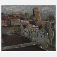 trutziger Kirchturm, umgeben von zahlreichen Häusern, unter wolkenverhangenem Himmel, pastose, teils gekratzte Malerei in gedeckter Farbigkeit, Öl auf Leinwand, auf Keilrahmen rückseitig bezeichnet "Lothar Gemmel DDR 80er Gemmel" sowie "200 €" und "319", hinterlegte Stelle, ungerahmt, Maße ca. 55 x 65 cm. Künstlerinfo: dt. Maler und Graphiker (1939 Berlin bis 1997 Weimar), 1954–56 Lehre und anschließend Tätigkeit als Schlosser, 1968–74 Abendstudium an der Kunsthochschule Berlin Weißensee bei Fritz Dähn, Günther Brendel und Arno Mohr, ab 1974 freischaffend in Ost-Berlin, Mitglied des Verbandes Bildender Künstler (VBK) der DDR, 1996 Umzug nach Weimar, Quelle: Eisold "Künstler in der DDR", Artikel der Thüringischen Landeszeitung von Christiane Weber und Internet.