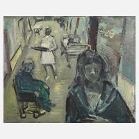 Blick auf einem tristen Gang mit Patienten, einer Krankenschwester und ein paar Stühlen und Betten, pastose Malerei, Öl auf Leinwand, um 1980–90, ungerahmt, Maße ca. 65 x 79,5 cm. Künstlerinfo: dt. Maler und Graphiker (1939 Berlin bis 1997 Weimar), 1954–56 Lehre und anschließend Tätigkeit als Schlosser, 1968–74 Abendstudium an der Kunsthochschule Berlin Weißensee bei Fritz Dähn, Günther Brendel und Arno Mohr, ab 1974 freischaffend in Ost-Berlin, Mitglied des Verbandes Bildender Künstler (VBK) der DDR, 1996 Umzug nach Weimar, Quelle: Eisold "Künstler in der DDR", Artikel der Thüringischen Landeszeitung von Christiane Weber und Internet.