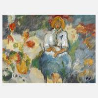 an einem Gartentisch mit Blumenstrauß sitzende junge Frau, lasierende, teils pastose Malerei mit breitem Pinselduktus, Öl auf Leinwand, rechts unten monogrammiert "H.H.", rückseitig auf der Leinwand bezeichnet "Herbert Helmert" und betitelt "Im Garten", gerahmt, Falzmaße ca. 60 x 80 cm. Künstlerinfo: dt. Maler und Zeichner (1924 Dresden bis 1997 München), Kindheit in Meißen, ab 1939 Lehre zum Porzellanmaler an der Meissener Porzellanmanufaktur, auf Anraten seiner Ausbilder 1940 Abbruch der Lehre und bis 1944 Studium an der Akademie Dresden, 1944 Übersiedlung nach Berlin, ab 1951 Studium an der Hochschule der Bildenden Künste Berlin-Charlottenburg bei Max Kaus und bis 1954 Meisterschüler von Karl Schmidt-Rottluff, ab 1965 in München tätig, unternahm 1965–68 Studienreisen nach Frankreich, hier beeinflusst durch Henri Matisse und Pierre Bonnard Quelle: Vollmer und Wikipedia.