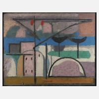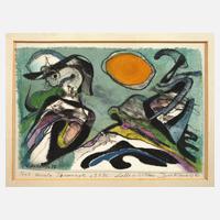 Mischtechnik auf Leinwand, signiert und datiert (19)75, auf Pappe geheftet mit Dedikation in Blei: "Frau Ursula Thomczyk z. 5.9.67. Lotte u. Willem Imkamp", im Passepartout gerahmt, Falzmaße 12 x 17,5 cm. Künstlerinfo: dt. Maler und Graphiker (1906 Münster bis 1990 Stuttgart), ab 1920 Schüler der "Gipsklasse" und ab 1922 Malstudien im Aktsaal an der Kunstgewerbeschule Münster, studierte 1926-29 mit Stipendium des Landes Westfalen am Staatlichen Bauhaus Dessau bei Josef Albers, Wassily Kandinsky, Paul Klee und Lyonel Feininger, 1929-30 Weiterbildung in Paris, ab 1930 freischaffend in Essen/Ruhr, 1933-39 offiziell ausschließlich als Portrait- und Landschaftsmaler tätig - die abstrakte Kunst entsteht im Verborgenen, um einem drohenden Berufsverbot zu entgehen, 1939 Umzug nach Gießen, 1939-45 Kriegsdienst, beschickte 1939-43 die Große Deutsche Kunstausstellung im Haus der Deutsche Kunst München mit realistischen Portraits, er fand hier regen Beifall der NS-Führung und wurde als "Kriegsmaler" an die Westfront verpflichtet, 1944 Zerstörung des Ateliers in Gießen und Umzug nach Allendorf/Lumda, 1948 Umzug nach Asperg, 1949 Mitglied der Künstlervereinigung "Die Schanze" in Münster, 1951 Mitglied der Künstlervereinigung "Gruppe sw" und Mitglied im Verband Bildender Künstler Württemberg, 1952-58 Jurymitglied im Stuttgarter Kunstverein, 1953 Umzug nach Stuttgart und 1963 Bau eines Atelierhauses auf dem Stuttgarter Killesberg, 1979 Verleihung des Professorentitels, Quelle: Vollmer, Wikipedia und Homepage Privatarchiv Wilhelm Imkamp.