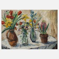 drei Blumenvasen mit Frühlingsblühern und ein Topf mit Hyazinthen, auf einem Tisch in heller Umgebung, stark pastose, mit kraftvollem Pinselstrich angelegte Blumenmalerei in leuchtender Farbigkeit, Öl auf Leinwand, links unten signiert und datiert "Kreß (19)70", gerahmt, Falzmaße ca. 54 x 71,5 cm. Künstlerinfo: auch Karl-Heinz Kreß, dt. Maler (1928 Königsberg bis 1979 Marburg), kam nach Kriegsdienst zum Ende des 2. Weltkriegs nach Schleswig, ab 1965 als Künstler freischaffend, erhielt wesentliche Impulse durch den in Marburg ansässigen Graphiker Franz Frank, er war Zeit seines Lebens ein großer Verehrer von Lovis Corinth, Quelle: Wikipedia.