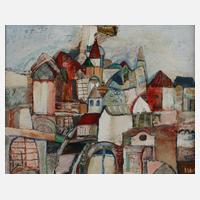 Blick über Dächer und Türme einer bulgarischen Stadt, pastose expressive Malerei mit breitem Pinselduktus und partieller Goldhöhung, rechts unten kyrillisch monogrammiert "ИМ [lat.: IM]", rückseitig bulgarisches und lateinisches Etikett, hier Infos zum Künstler und Gemälde "Jlia Milkov, geboren 1927, Jitel, Material: ... Pappe, Technik: Ölfarbe" und datiert "XII.[19]97 г. [Dezember 1997]", gerahmt, Falzmaße ca. 40 x 50 cm. Künstlerinfo: bulgarisch Илия Милков, auch Iliya Milkow, Milkoff bzw. Iliya Milkov Varbenov, bulgarischer Maler, Cartoonist und Zeichner (1927 Stavertsi [Ставерци] bei Plewen bis 2009), erste künstlerische Ausbildung in Stavertsi, Studium in Orjachowo und Wraza, ab 1950 Karikaturist für eine lokale Zeitung, ab 1967 Mitglied im bulgarischen Künstlerverband, beschickte unter anderem Kunstausstellungen in Sofia, Plovdiv, Ruse, Oreshak und Nikopol sowie in Mexiko, Russland, Polen, der CSSR, dem Irak und Paris, Ehrung mit dem Orden „Kyrill und Method“ 1. und 2. Grades für Verdienste in der Bildenden Kunst und wurde zum Ehrenbürger von Plewen ernannt, Quelle: Internet.