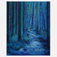 im mystischen Blau einer Mondnacht leuchtender Wald, pastose Malerei in kraftvoller Farbigkeit, Acryl auf Leinwand, links unten signiert "L. Nowosielski", auf der Rückseite bezeichnet und datiert "Leszek Nowolsielski/1998" sowie Adressaufkleber des Künstlers, gerahmt, Falzmaße ca. 46 x 38,5 cm.