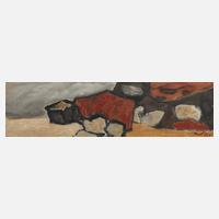 auf Flächen reduzierte Felsen in Grau- und Rottönen vor grau changiertem Himmel, leicht pastose Malerei in gedeckter Farbigkeit, Öl auf Leinwand und auf Hartfaserplatte kaschiert, um 1990, rechts unten monogrammiert, vorwiegend im Randbereich einige kleine Nägel und geringe Farbverluste, ungerahmt, Maße ca. 18 x 59 cm. Künstlerinfo: dt. Künstler niederländischer Herkunft (1920 Angermund bis 2008), Kindheit und Jugend in Duisburg-Großenbaum, 1932 Umzug der Familie nach Nijmegen, Lehre als Werbegraphiker, Umzug nach Düsseldorf, nach dem 2. Weltkrieg Studium an der Akademie in Düsseldorf bei Otto Coester, Wilhelm Schmurr und Werner Heuser, 1949 Studienreise nach Paris und hier Bekanntschaft mit Pablo Picasso, Pierre Bonnard und Georges Braque, ab 1951 Mitglied der Rheinischen Sezession, 1952–53 Aufenthalt in Granada, in den 1970–80er Jahren zahlreiche Studienreisen, Quelle: Vollmer-Nachtrag und Wikipedia.