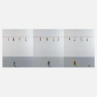 jeweils vier Personen an einer roten Leine hängend, über stark reduzierter Landschaft, im unteren Bereich vereinzelte Personen, für den Künstler typische Arbeiten, Acryl auf Leinwand, um 2000, jeweils auf der Rückseite signiert "Jens Ulrich Petersen", minimal berieben, Keilrahmenmaße je ca. 80 x 60 cm. Künstlerinfo: dänischer Künstler (geboren 1947), Quelle: Internet.