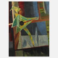 abstrahierter, auf Flächen reduzierter Artist, mit Banjo in der Manege, leicht pastose Malerei in ausgewogener Farbigkeit, Öl auf Leinwand, um 1960, rechts unten signiert "Schmolling", leichte Farbschwundspuren, gerahmt, Falzmaße ca. 76 x 58 cm. Künstlerinfo: dt. Maler und Graphiker (1892 Brandenburg an der Havel bis 1965 Traisa bei Darmstadt), Studium an der Unterrichtsanstalt des Berliner Kunstgewerbemuseums bei Emil Orlik und kunstgeschichtlich Studien an der Universität Berlin, Mitglied der Novembergruppe, tätig in Berlin und nachfolgend ansässig in Insterburg/Ostpreußen und Elmshorn, 1937 Beschlagnahme zweier Arbeiten im Rahmen der Aktion „Entartete Kunst“, 1940 Teilnahme an der Großen Deutschen Kunstausstellung in München, Mitglied der Reichskammer der bildenden Künste, Quelle: Vollmer und Wikipedia.