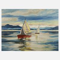 rotes Segelboot auf stillem See in Vorgebirgslandschaft, pastose Malerei mit breitem Pinselduktus, Öl auf Karton, rechts unten undeutlich signiert und datiert "Schulz Carrnoff [19]47", rückseitig teils unleserlich dediziert "Meinem lb. Freund X. Haerble! ...", Malgrund wellig, reinigungs- und etwas restaurierungsbedürftig, gerahmt, Falzmaße ca. 55,5 x 75,5 cm. Künstlerinfo: auch Erwin Schulz Carnoff bzw. Schoultz-Carrnoff, nannte sich ab 1960 "Erwin Shoultz-Carrnoff", dt. Maler und Graphiker (1913 Königsberg/Preußen bis 1990 München), Kindheit bei Groß Skaisgirren/Kreuzingen [Bolschakowo] Kreis Elchniederung, Malschüler bei Heinrich Schmalz und Rudolf Lengrüsser in Königsberg, studierte an der Akademie Königsberg, folgte 1939 Rudolf Lengrüsser bei seinem Weggang nach Wien, zeitweise in Stuttgart tätig, Studienaufenthalt in den Niederlanden, anschließend Schüler von Karl Caspar in München, 1936 erster Aufenthalt in Traunstein, hier beeinflusst von Werner von Houwald, Kriegsdienst im 2. Weltkrieg in Finnland und Norwegen, 1945 Gründungsmitglied der Künstlergruppe "Der Rote Reiter" in Traunstein/Oberbayern und bis 1990 deren Präsident, unternahm Studienreisen nach Belgien, Holland, Italien, Finnland und Norwegen, beschickte 1949 die 2. Deutsche Kunstausstellung in Dresden, 1975 Ehrung mit dem Schwabinger Kunstpreis, tätig in Traunstein, Mitte der 1960er Jahre Übersiedlung nach München, Quelle: Vollmer, Saur "Bio-Bibliographisches Künstlerlexikon", Ausstellungskatalog "Rote Reiter“ 2005 Traunstein, "Künstlerlexikon Ostpreußen und Westpreußen" und Wikipedia.