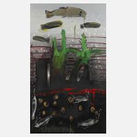 abstrakte Unterwasserlandschaft mit Fischen, in leuchtender Farbigkeit, mit breitem Pinselduktus flott erfasste Malerei, Öl auf Leinwand, am unteren Rand datiert und signiert 1993, in grün lackiertem Holzrahmen, Falzmaße 128 x 80 cm. Künstlerinfo: zeitgenössischer litauischer Maler, studierte an der Jouzas Naujalis Art School in Kaunas, dann Malerei in Vilnius, 1990-93 Studium in Leipzig. Quelle: Internet.