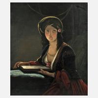 junge Frau mit Turban bei der Lektüre im dämmrigen Interieur, fein lasierende Kopie nach der 1839 entstandenen ersten Version des Motivs "Die Morgenländerin" von Friedrich von Amerling" (1803-1887), Öl auf Hartfaserplatte, Mitte 20. Jh., unsigniert, rückseitig fehlerhaftes Etikett "Amerling 1892", Craquelure, restauriert, etwas restaurierungsbedürftig, ungerahmt, Maße ca. 72,5 x 62 cm.