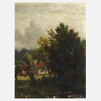 einsamer, auf einer sonnenbeschienen Wiese am Waldrand stehender Bauernhof unter locker bewölktem Himmel, leicht pastose Landschaftsmalerei, Öl auf Pappe, Ende 19. Jh., links unten signiert "Brinckmann", minimale Verluste, Retuschen, gerahmt, Falzmaße ca. 18 x 14 cm. Künstlerinfo: auch Brinkmann, dt. Landschaftsmaler und Illustrator (1830 Horneburg bis 1902 Düsseldorf), ab 1852 in Düsseldorf ansässig und hier Privatschüler von Alexander Michelis und Johann Wilhelm Schirmer, seit den 1860er Jahren auch als Illustrator tätig, Mitglied des Künstlervereins Malkasten, Quelle; Thieme-Becker, Boetticher und Wikipedia.