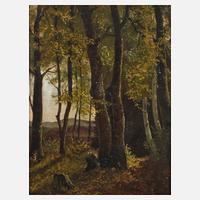 Blick aus dem lichten Rand eines Laubmischwaldes in die hügelige Landschaft, die Bäume durch das Sonnenlicht Schatten werfend, atmosphärisch dichte Malerei in gedeckter Farbigkeit, Öl auf Malkarton, wohl um 1880, rückseitig auf dem Rahmen Etikett von "Antiquitäten-Walter" aus Weimar mit Annotationen zu Werk und Künstler sowie auf dem Malkarton wohl von Künstlerhand in Blei betitelt und nummeriert "Waldstudie 932", dazu wohl von fremder Hand in Tusche bezeichnet "Karl Buchholz - Weimar", Provenienzstempel von früherer Ausstellung "Thueringer Museum in Eisenach" und schmales Klebeetikett des Malkartons (Firma Pelikan), etwas reinigungsbedürftig, geringe Retuschen, gerahmt, Falzmaße ca. 30 x 24 cm, Künstlerinfo: dt. Maler, Zeichner und Radierer (1849 Schloßvippach/Landkreis Sömmerda bis 1889 Oberweimar), zunächst Lehre zum Stubenmaler, mit Stipendium studierte Buchholz ab 1867 an der Großherzoglich-Sächsischen Kunstschule Weimar bei Alexander Michaelis und Max Schmidt, unterhielt ab 1867 bereits eigenes Atelier, ab 1871 Meisterschüler von Theodor Hagen, beschickte Ausstellungen in Dresden, Wien und München, tätig in Oberweimar, wählte schließlich den Freitod, Quelle: Thieme-Becker, Scheidig "Die Weimarer Malerschule", Boetticher, Müller-Singer und Wikipedia.