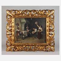 zwei junge tanzende Frauen mit Tamburin im Interieur von zwei Wein trinkenden bzw. Laute spielenden Männern am Kamin beobachtet, lasierende Genremalerei, Öl auf Leinwand, um 1900, rechts unten signiert "Fr. Donati", rückseitig mehrfach Berliner Eigentümerstempel, geringe Craquelure, hinter Glas im ca. 18 cm breiten Florentiner Rahmen mit Messingrahmenschild "F. Donati" gerahmt (rest.bed.), Falzmaße ca. 55,5 x 69 cm.
